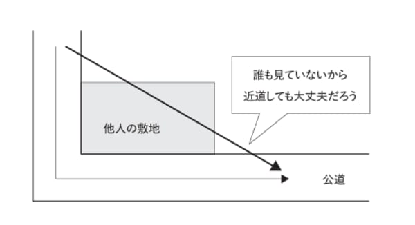 決められた経路では遠回りになり面倒なので、時間と労力節約のためにリスクを冒して、道路ではない他人の敷地に立ち入り、近道をするというのが典型です。〈図6〉