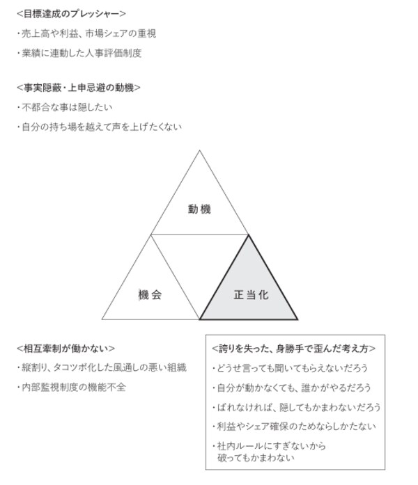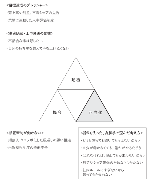 ルール逸脱に関連し、不正などの企業不祥事が起きるメカニズムを説明した、「不正のトライアングル」という組織犯罪学上の考え方があります。