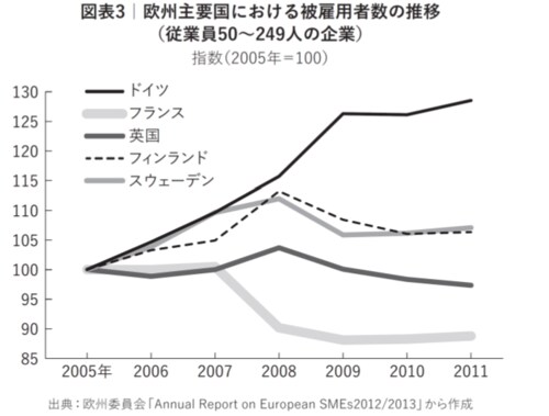 また、欧州主要国における従業員50〜249人の企業の被雇用者を見ても、ドイツの伸びが最も大きい(図表3)。序章で「ミッテルシュタント」という言葉を紹介したが、このようなデータを見ても、ドイツにおいてはやはり「中小企業が経済を支えている」と言えそうである。