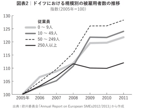 一方で、ドイツの中小企業は、2000年代に入って以降、大企業を凌ぐペースで成長している。雇用者吸収に大きく貢献したのも中小企業であり、図表2に示すように、ドイツにおける規模別の被雇用者の伸びは従業員50〜249人規模の企業が最も大きい。