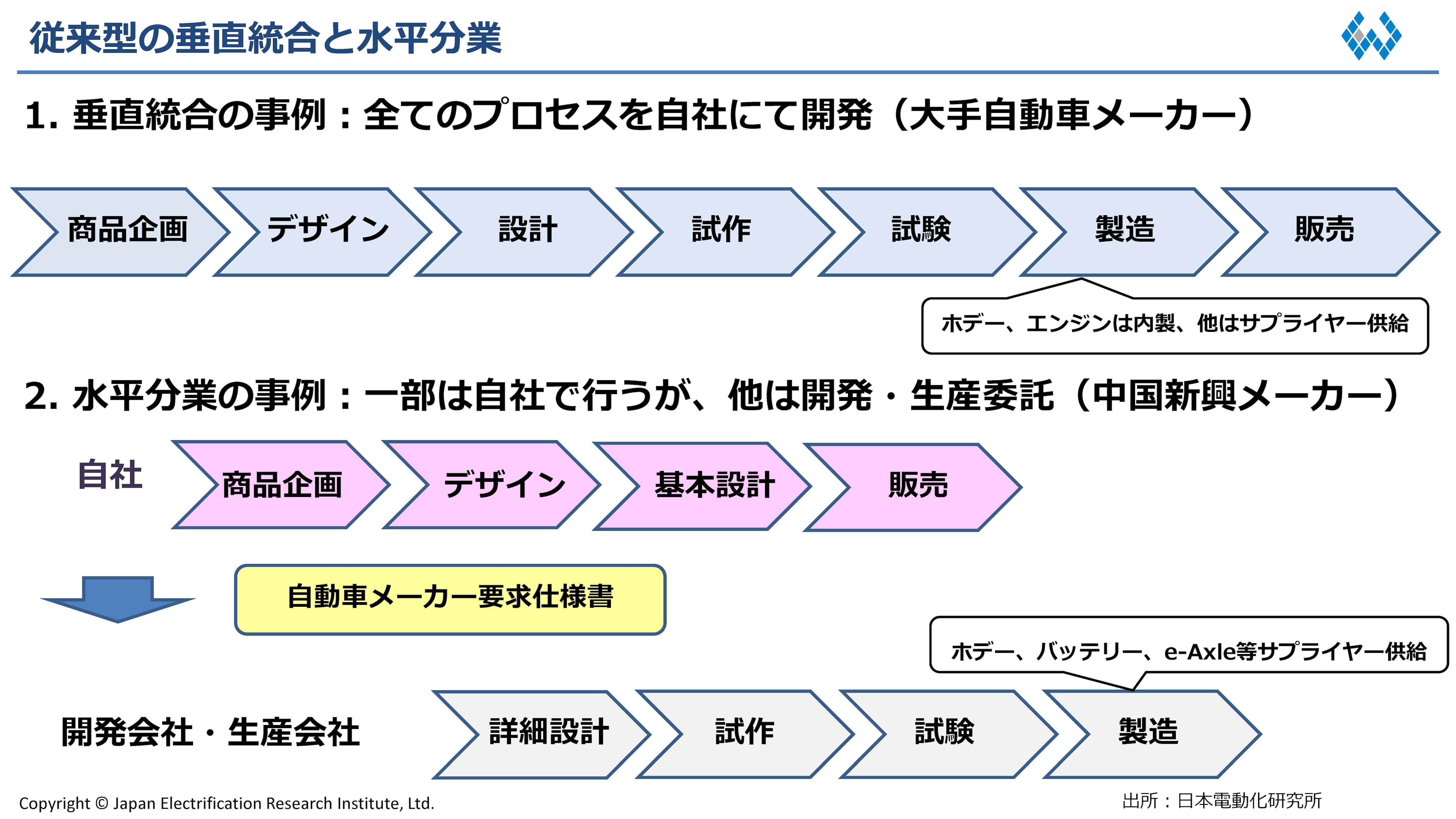 図2 従来型の垂直統合と水平分業 (出所:日本電動化研究所)拡大画像表示