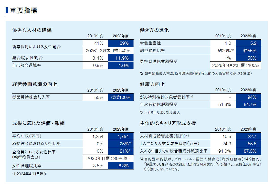 第二に、人材戦略への注力である。2010年度から始まったとされる働き方改革が、同社の考える労働生産性の向上につながっていること、その結果、就職ランキングでトップクラスにあり、優秀な人材の確保につながっていることなどがKPI(重要業績評価指標)とともに示されている。