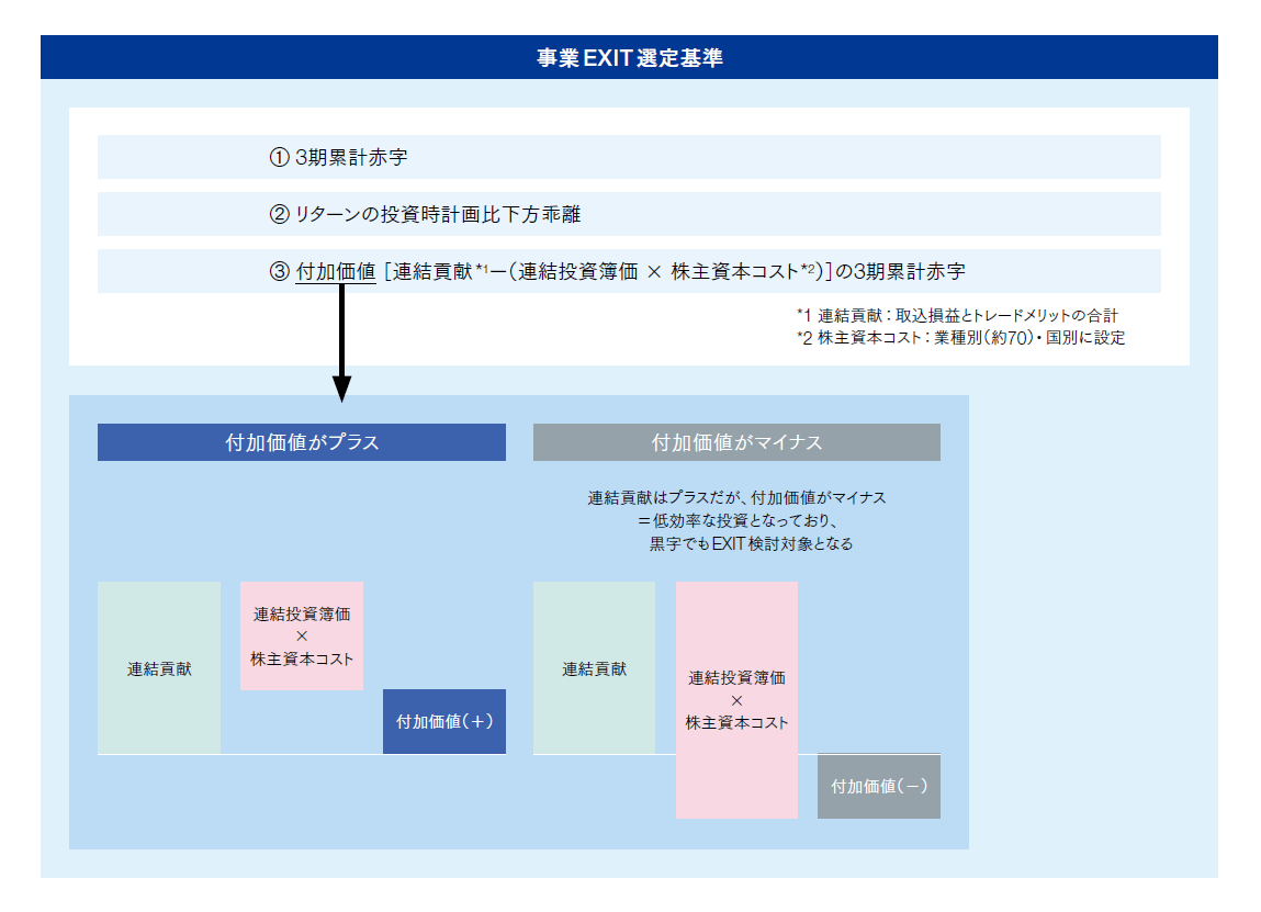 具体的には投資意思決定の時点でEXIT基準(主に損失が拡大しないように定めたロスカットの目安と見られる)を設け、投資実行後は継続的にモニタリングを行う。もし、EXIT基準に抵触した場合には、組織としてチェックをかける仕組みである。
