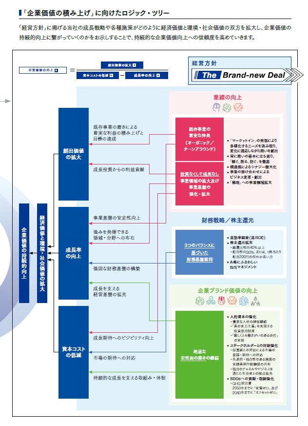 ちなみに、2021年度から2023年度までの中期経営計画「Brand-new Deal 2023」では、マーケットインによる事業変革とSDGsへの貢献・取り組み強化が主たる施策であった。一方、現行の経営方針「The Brand-new Deal」では、まず「投資なくして成長なし」という方針が示され、続いて「定性面の磨き」「成長投資・株主還元・有利子負債コントロールのバランスに基づいた財務基盤堅持」という考え方が示されている。