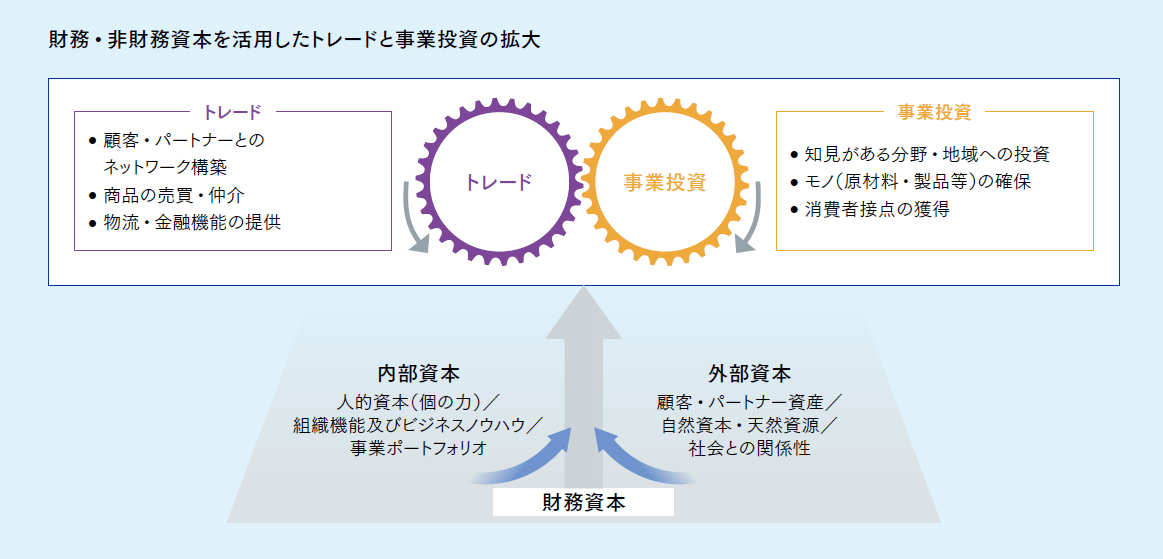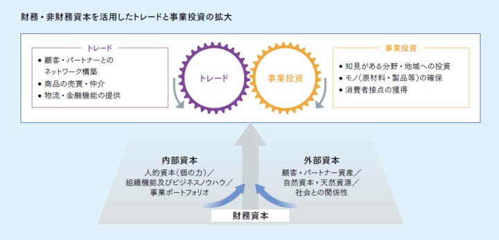 「統合レポート」では、CXO(経営幹部)のインタビューで成長戦略と事業間シナジーの最大化に対するコミットメントが語られている。それらに続いて、事業投資の実施と商流の拡大の相乗効果を狙うビジネスモデル、戦略的資産入れ替え、および川下起点のマーケットイン型のビジネスモデルの磨き上げなど、同社らしい成長モデルが示されている。