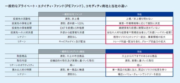 これによって結果的に、商流の取り込み・拡大にとどまらず、投資先の価値向上も実現することになる。このビジネスモデルのユニークな特色が、一般的なプライベートエクイティとの違い、およびコモディティ商社との違いとしてp53に整理されており、一見に値する。
