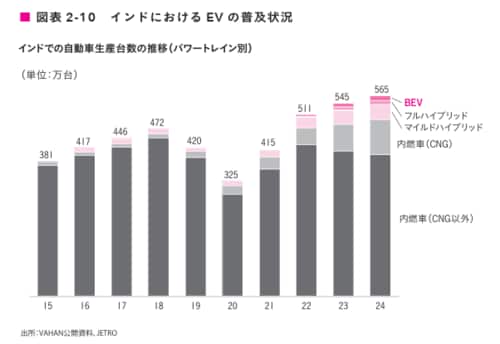 パワートレイン別に見ると、生産台数の内、内燃機関(ICE)車が90%強を占め、EVは約2%と僅少です。しかし政府は「2030年までに新車販売の30%をEVに」との方針を打ち出しており、政府主導のEVインフラ整備や購入者・製造業者双方向けの補助制度の整備も進みつつあります。スズキはインド現地で25年4月よりEV生産を開始しており、Teslaも工場設立を表明(25年4月時点)するなど、今後インド国内でのEV製造が加速していく萌芽が見え始めています。