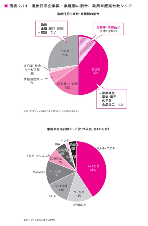 インドに進出する日系企業のうち6割超は製造業であり、その15%が自動車関連と、同産業は日系企業のインド展開の中核を担っています。周知の通り、なかでもスズキは1983年の先んじた市場参入の経営判断以降、現地法人マルチ・スズキを通じてインド最大の販売シェアを長年維持してきました。2023年度時点で同社のシェアは約41%に達しており、依然として最大手です。