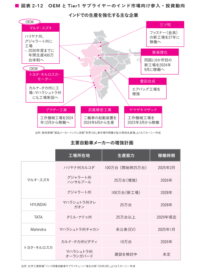 豊田合成はエアバッグの現地生産体制を強化、東海理化は6カ所目となる新工場を設置予定で、三ツ知はファスナーの新工場を2027年に稼働予定としています。また二輪車向けでは武蔵精密が駆動部品工場を、また工作機械の供給を目論むブラザー工業やヤマザキマザックも現地生産能力の拡大を進めています。