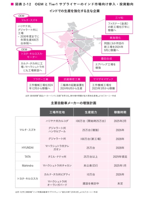 国内需要の急拡大と、コスト・納期両面での競争圧力を背景に、OEM各社はサプライヤーに対し、開発段階からの現地調達化を要請しています。例えばスズキでは、新車種の開発初期から「どの部品を現地調達化するか」を本社と共有し、ティア1サプライヤーにも、現地での評価・車両適合・市場ニーズへの対応などのR&D機能の内製化を働きかけています。