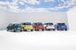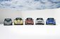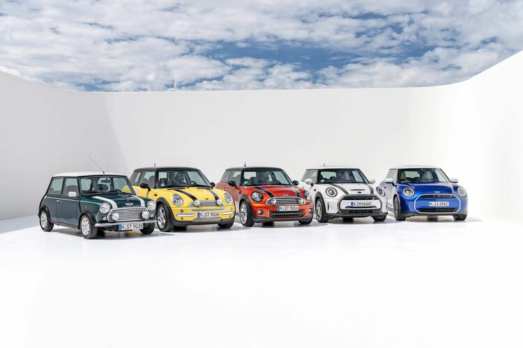 歴代MINI。公式には左から「Mini Cooper Gen 1 Mk VII」「 MINI Cooper Gen 2 Mk I」「 MINI Cooper Gen 3 Mk II」「 MINI Cooper Gen 4 Mk III」と、世代と世代内バージョン(Mk.)で表現している。一番右、最新のMINIは「MINI Cooper SE」と表記されているが、このルールに従えば第5世代の初代となるので「MINI Cooper SE Gen 5 Mk I」か