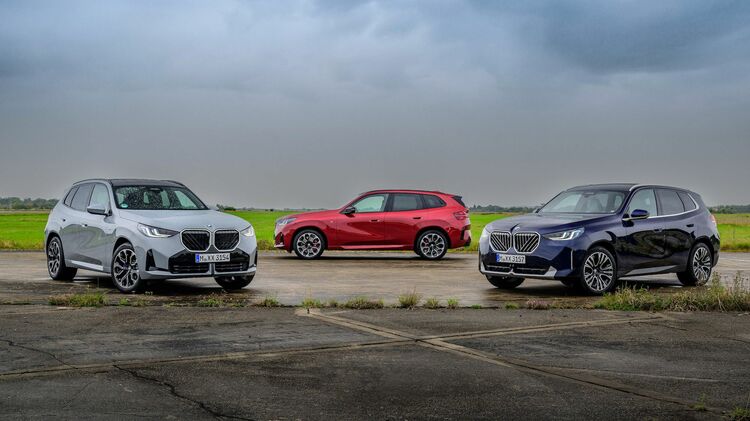 左がBMW X3 20 xDrive M Sport Package、右がBMW X3 20 xDrive、中央奥がBMW X3 M50 xDrive。X3 20は直列4気筒、X3 M50は直列6気筒エンジンモデル。いずれもトランスミッション内に電気モーターを持つマイルドハイブリッド仕様