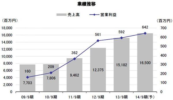 2014年9月期は、売上高が前期比8.7%増、営業利益が同8.5%増と期初会社計画を据え置いたが、営業利益の第2四半期までの進捗率は70%に達しており、上振れする可能性は大きいと弊社ではみている。
