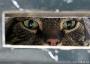 細長い穴から外を見る猫の2つの目、なにを監視しているの?