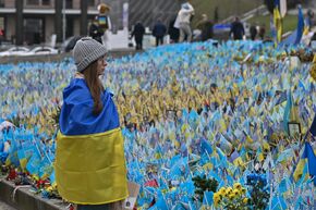 《ウクライナ写真ルポ》戦死者を示す旗が独立広場に増え続ける首都キーウ 王女の像にも防弾ベスト