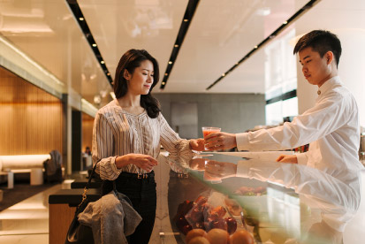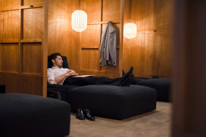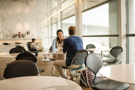 食に関しては、アジア各国の麺料理や焼き立てのパンやピザ、プロのバリスタによるひきたてのコーヒーが楽しめる。大理石のバーカウンターを備えた「ザ・ロング・バー」では、飛行機を眺めながらカクテルグラスを傾けることもできる。シャワーを浴びた後、フットレスト付きのローソファーでくつろげば、まるでホテルにいるような錯覚すら覚える。ワークステーションも整っているため、急な出張にも余裕をもって対応可能だ。
