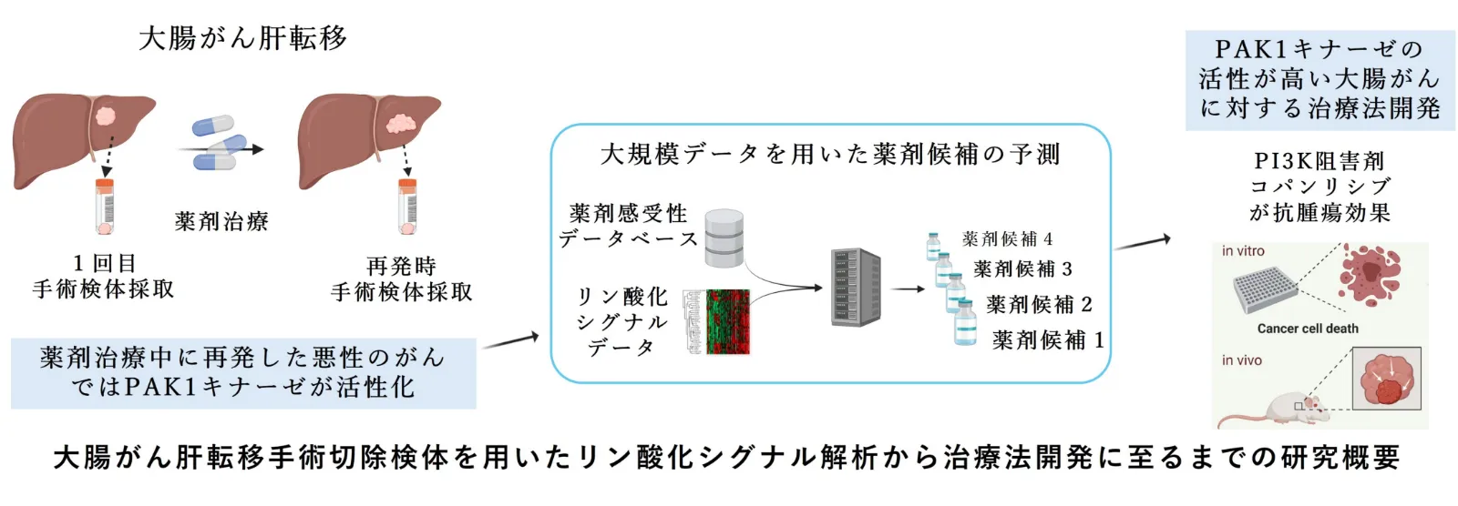 同様に、大腸がんが肝臓に転移した場合についても、リン酸化シグナル解析を行った結果、手術後の化学療法中に再発した場合にPAK1という酵素が活性化していることが分かった。ところが現在、PAK1の活性を抑える治療薬は実用化されていない。そこで、PAK1の活性化に関わる別のタンパク質であるPI3Kという酵素に注目した。PI3Kの活性を抑える物質のうち、コパンリシブという薬はリンパ腫の治療ですでに使用されている。実際にコパンリシブを使用すると、大腸がんの増殖を抑えられることが培養細胞とマウスの実験から判明した(図2)。