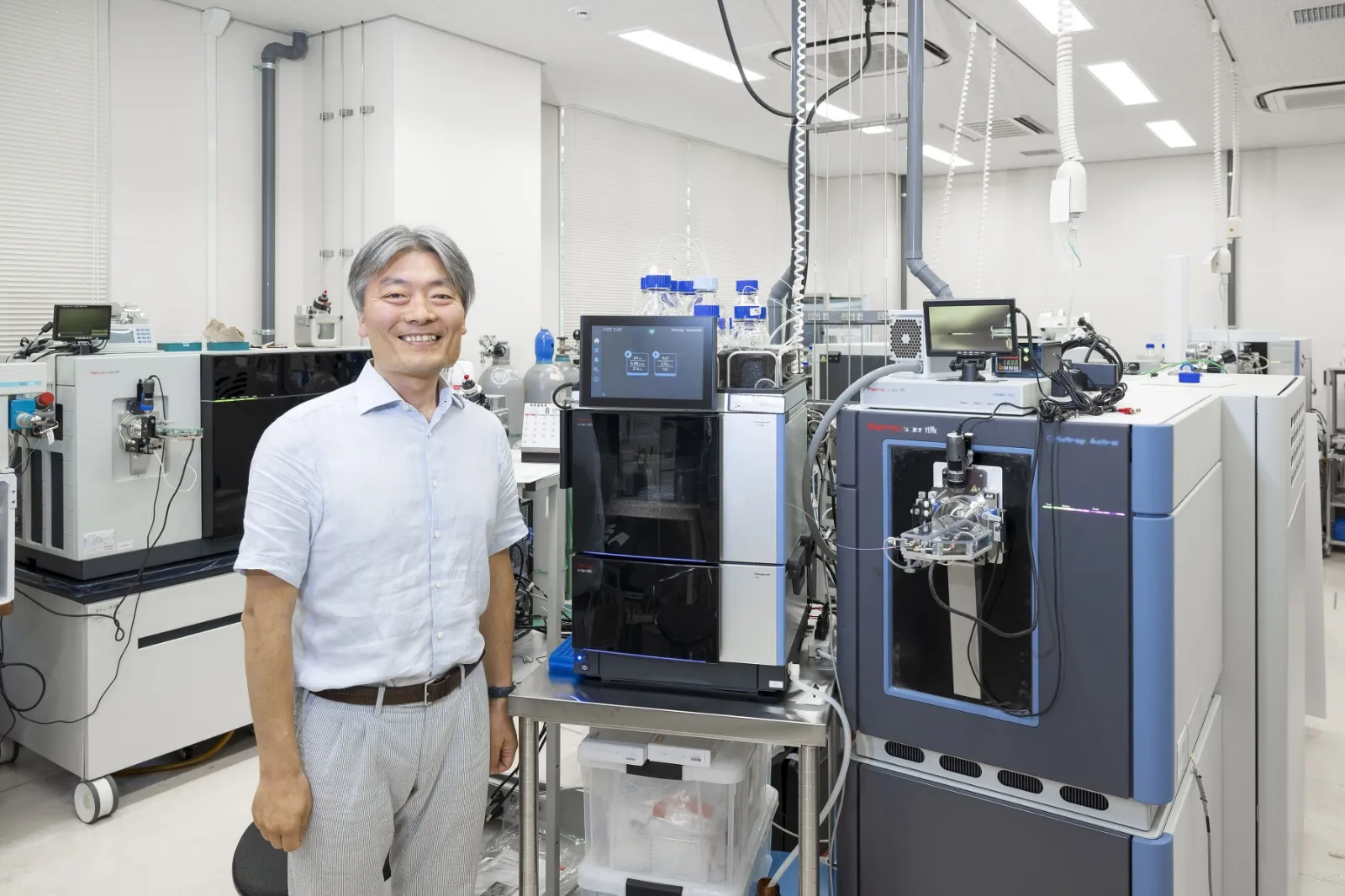 プロテオーム解析を実現しているのが、「質量分析計」という装置だ。質量分析計は物質の質量を精密に測定する装置で、タンパク質やその他の分子の質量を種類ごとに計測できる。