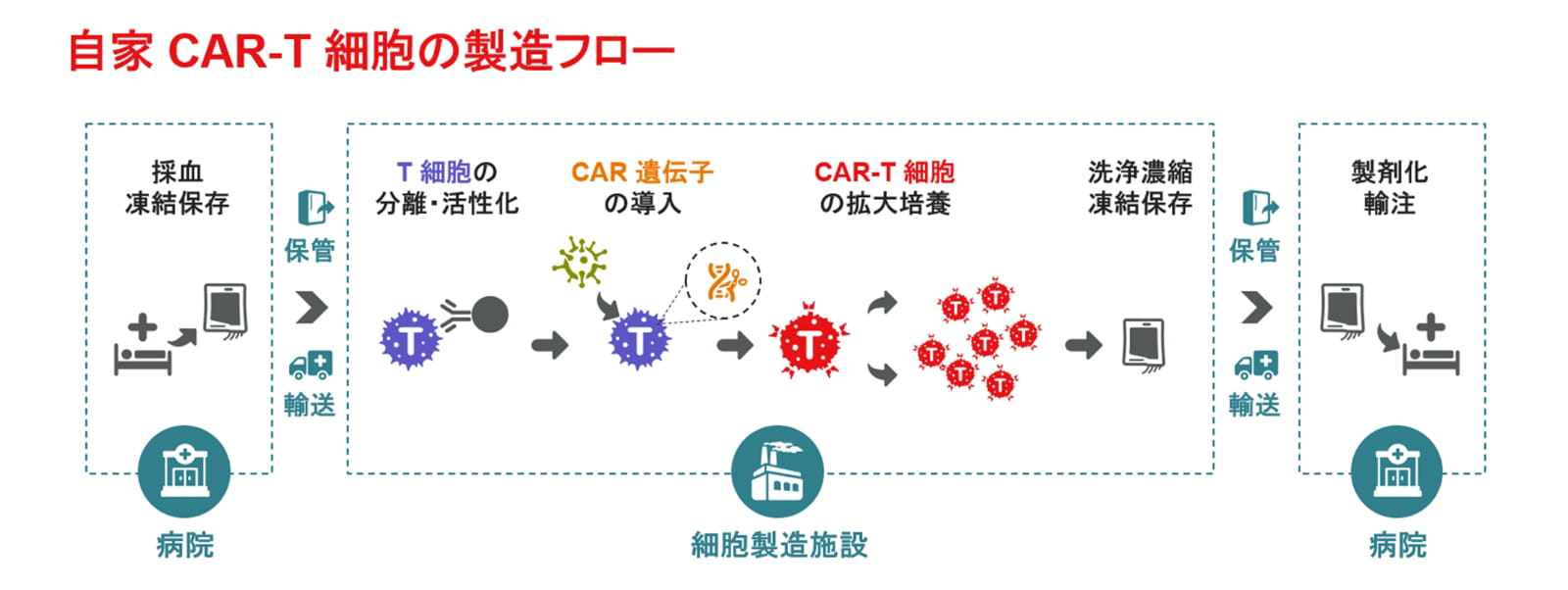 まず、①血液がんの患者から血液を採取し、凍結して製造工場に送る。②届いた血液を融解し、目的の細胞となるT細胞(免疫細胞の一種)を分離する。③分離したT細胞に外から遺伝子を導入し、がん細胞を認識する機能を持たせる。④それがCAR-T細胞であり、必要数まで増殖させて増やしていく。⑤増やしたCAR-T細胞は洗浄後、凍結保存して病院へ輸送される。それを病院で解凍し、製剤化した上で患者に投与する――。大まかに言うと、こうだ。