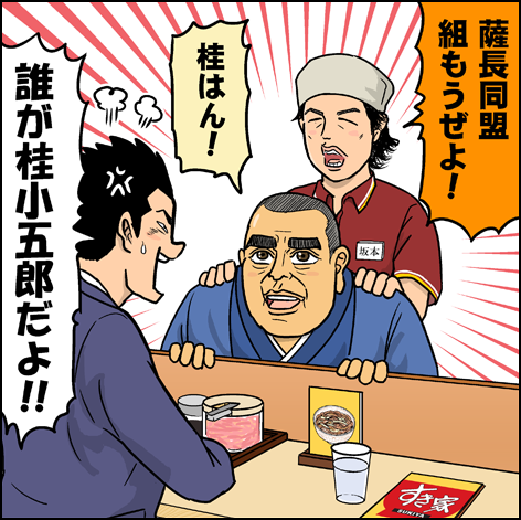 「これからは牛丼よりも西郷どんぜよ!」――ふらりと入ったすき家にいたのはどこかで見たことのある土佐訛りの男。いやいや"西郷どん"はいいから牛丼ください。「はい牛丼一丁!並盛?大盛?それとも"隆盛"? わっはっはっ、ニッポンの夜明けぜよー!(ザッパーン)」。とりあえず、オレは黙って店を出た。