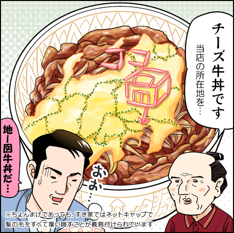 「チーズの牛丼ください」と注文し、待つこと数十分。稀代の測量技師・伊能忠敬によって完璧に描かれた“地ー図牛丼”がやってきた。客はしばし呆然。その後スマホを取り出し牛丼の写真をパチリ。最後は伊能忠敬と肩を組んで記念写真を一枚。「はい、地~図!」